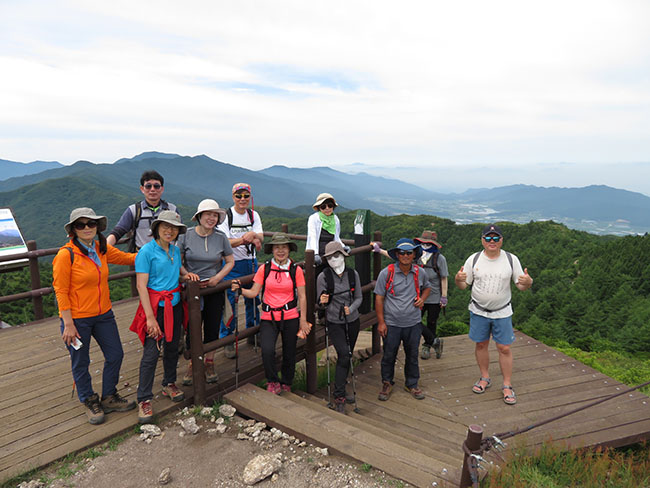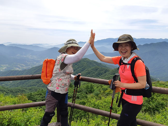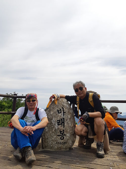 바위에서 지리산을 바라보다 반갑게 웃어주는 회원들