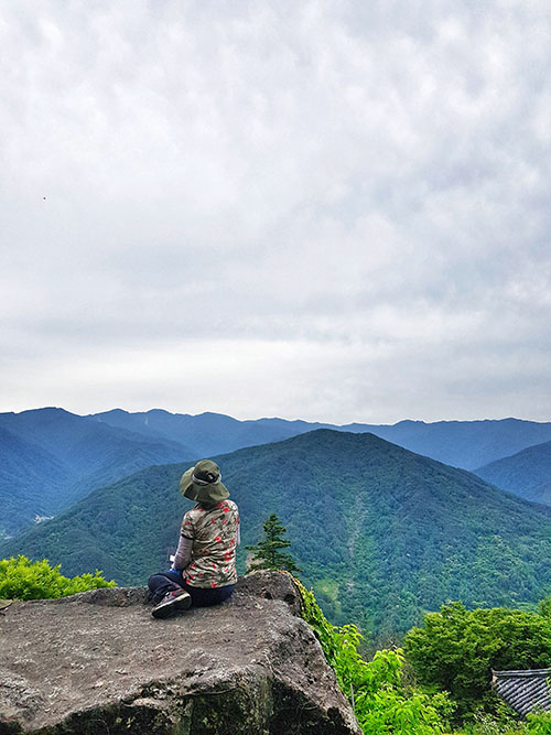 1403년 행호조사가 창건한 해인사 말사인 금대암. 금대암 암자 뒤 바위에 올라앉았습니다. 바래봉에서 바라 본 지리산의 이곳저곳은 까맣게 잊을 만큼 금대암에서 조망하는 지리산이란.. 주민숙회원의 얘기처럼 훨~ 날아갈 수 있을 것만 같았습니다. 길쭉하니 서있는 전나무도 인상적이었고요.